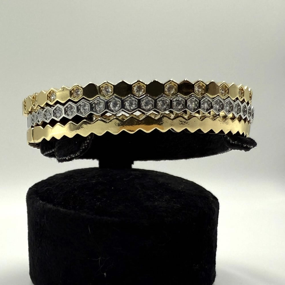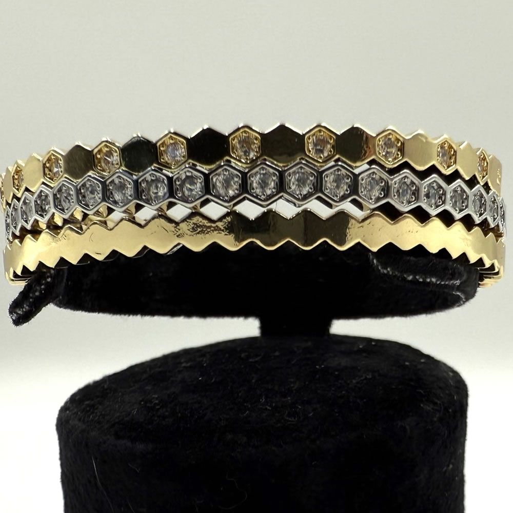 Altıgen desenlerin modern çizgisi ve zigzag formunun dinamizmi, bu üçlü bileklik setini güncel trendlerle buluştururken, altın ve gümüşün klasik çekiciliği zamansız bir hava katıyor. Bu sayede, setiniz yıllar geçse de modası geçmeyecek, her zaman güncel ve şık kalacaktır. Modern ve zamansız estetiği bir araya getiren bu tasarım, takı koleksiyonunuzda kalıcı bir yer edinecektir.