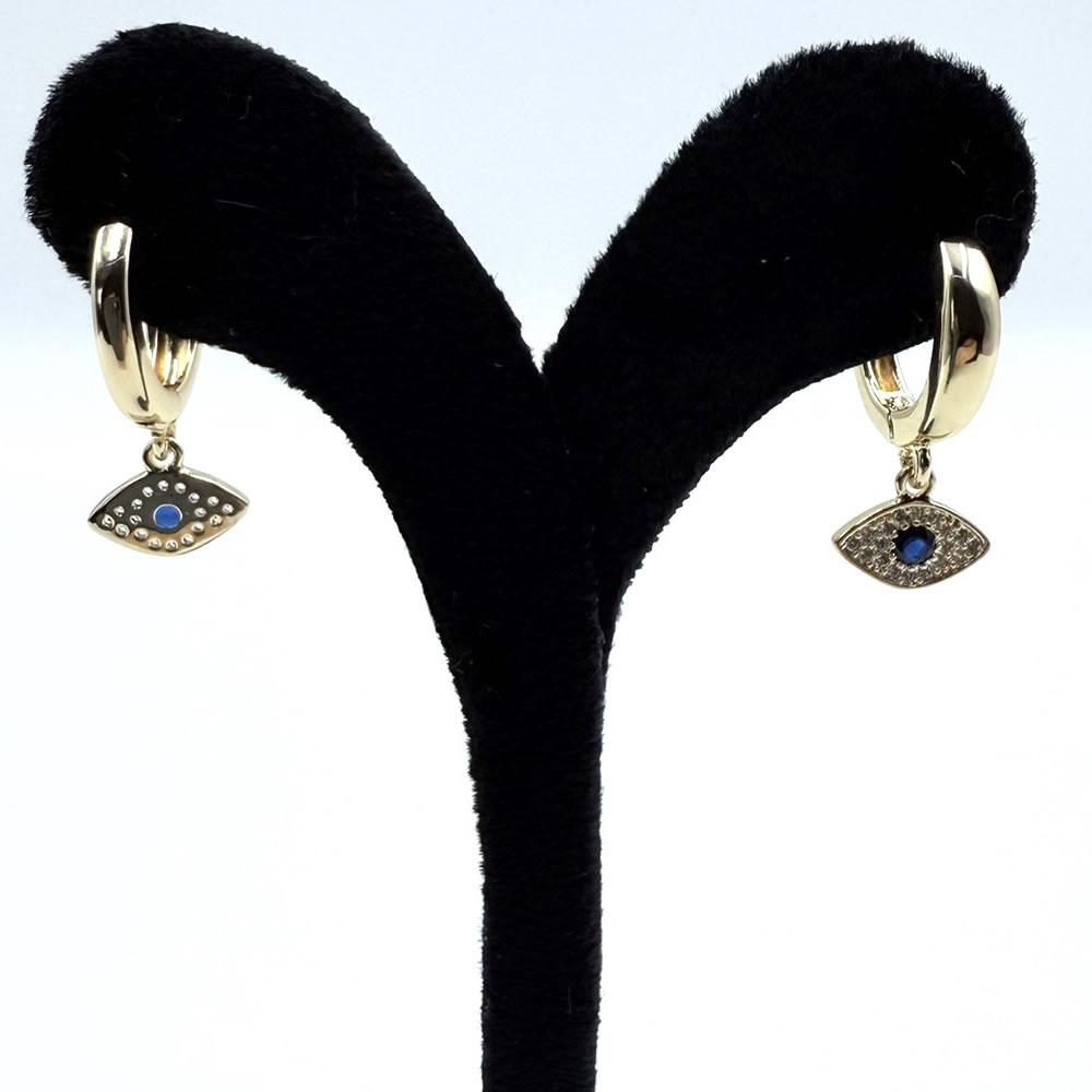 Göz şeklindeki sallantılı şarmlarıyla tasarlanan bu altın tonlu halka küpeler, tarzınızı yansıtmanın zarif bir yoludur. Her şarmın ortasında yer alan mavi taş ve etrafındaki parıltılı detaylar, küpelere hem anlamlı hem de dikkat çekici bir görünüm kazandırır. Nikel içermeyen ve alerji riskini azaltan malzemelerden üretilmiştir, bu nedenle hem günlük kullanım hem de özel günler için idealdir. Şık hediye kutusunda sunulduğundan, sevdiklerinize hediye etmek için de mükemmel bir seçimdir.