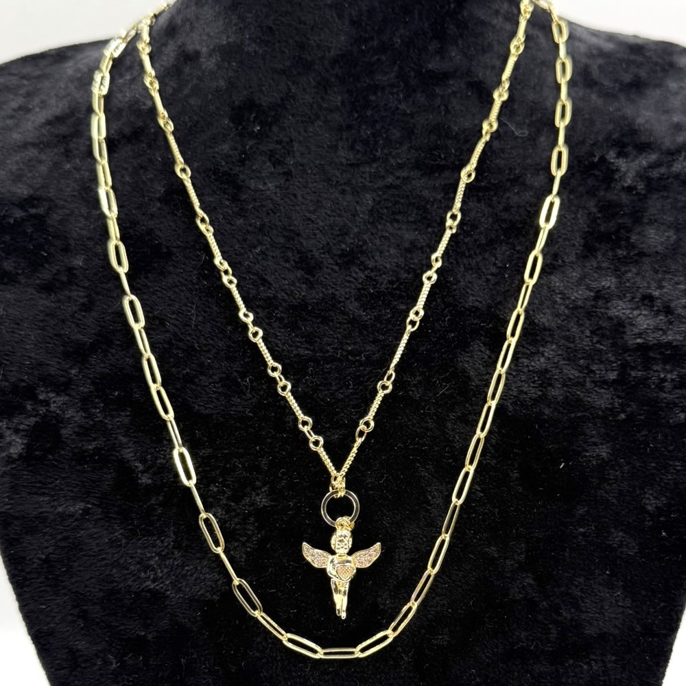 Zarafeti ve anlamı bir araya getiren özel bir parça arıyorsanız, işte karşınızda **Melek Figürlü Altın Kaplama Kolye**. Bu çift katlı pirinç kolye, hem şık tasarımıyla göz kamaştırıyor hem de taşıdığı melek figürüyle manevi bir anlam katıyor.